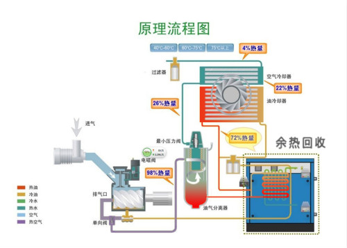 在以上過(guò)程中,高溫高壓的油、氣所攜帶的熱量大致相當(dāng)于空氣壓縮機(jī)功率的3/4其溫度通常在80℃—100℃之間。螺桿式空氣壓縮機(jī)通過(guò)其自身的散熱系統(tǒng)來(lái)給高 溫高壓的油、氣降溫的過(guò)程中,大量的熱能_被無(wú)端的浪費(fèi)了。