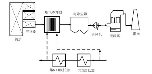 在凝結水方面,從N級低壓加熱器入口抽取一部分凝結水,進入煙氣冷卻器后被加熱,返回至N+1級(按實際情況而定)低壓加熱器出口,從而節(jié)省低壓加熱器的抽汽,增加汽輪機的做功,節(jié)省煤耗。