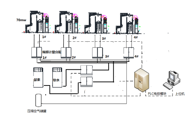 尿素溶液經(jīng)配制并儲存后,由在線稀釋系統(tǒng)根據(jù)鍋爐運(yùn)行情況和NOx排放濃度情況在線稀釋成所需的噴射量,送入噴射系統(tǒng)。噴射系統(tǒng)實(shí)現(xiàn)各噴射層的尿素溶液分配、霧化噴射和計量,還原劑的供應(yīng)量能滿足鍋爐不同負(fù)荷的要求。整套電氣控制系統(tǒng)調(diào)節(jié)方便、靈活、可靠,在設(shè)備間、爐房噴點(diǎn)現(xiàn)場及控制室均能聯(lián)動控制。鍋爐脫硝整體工藝流程如下: